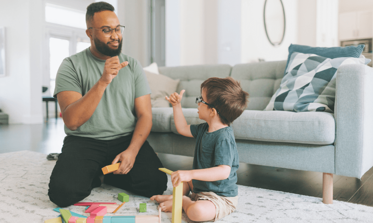 • Set up a bilingual language schedule. If you’re using both sign language and spoken language at home, it can be helpful to keep the two separate so your child can learn each language clearly. For example, you might use ASL only during dinner or using only sign language during playtime, then use spoken English at other times. Mixing the two at once, also called simultaneous communication (SimCom), can be confusing — especially for kids who are still learning. ASL and English follow different rules, so using them together often leads to changes that make both languages less clear. Separating them helps your child fully access and learn each language.